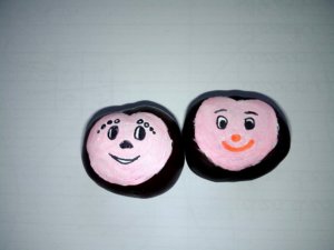 A gesztenyéknek a világosabb részüket befestettem fehér akrilfestékkel, száradás után alkoholos filccel megrajzoltam az arcokat is, majd mivel túl fehérek voltak, adtam még nekik egy halovány rózsaszín festékréteget.