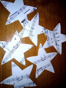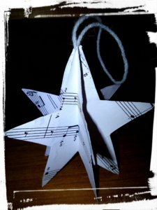 Nálunk a gyerekek zongoráznak, ezért adott a kotta papír. Vannak régiek, még régebbiek és persze újak is. Egy éppen több napja kallódó kotta jött velem mindig szembe, míg fel nem használtam és lett belőle karácsonyi dísz csillag formájában.