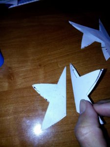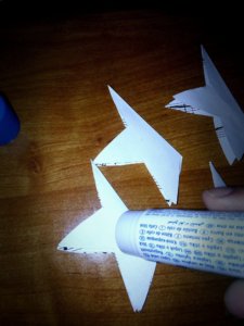 A félbehajtott csillagokat bekenjük papír ragasztóval. Egymásra illesztjük.