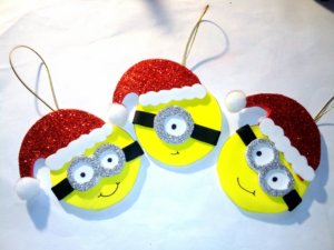 Hasonló ötletet itt: https://craftsbyamanda.com/minion-ornaments/ találtam, csak az éppen filcből és pufifestékből készült, ezek pedig dekorgumiból.